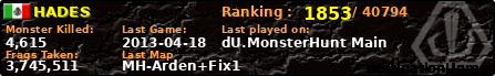 HADES | | PlayerID: | 13175 | | Overall MHT: | 3,745,511 | | Overall Deaths: | 188 | | Overall Suicides: | 1 | | Overall TeamKills: | 0 | | Overall Distance traveled: | 265km | | Overall Time Spend on Server: | 01days 10h 39m 48s | | Maps Played: | 68 | | Firstgame: | 2013-04-01 13:16:25 | | LastGame: | 2013-04-18 10:25:28 | | Player Ranking Place: | 1853 | | Used Playernames: | HADES
