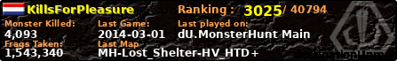 KillsForPleasure | | PlayerID: | 13203 | | Overall MHT: | 1,543,340 | | Overall Deaths: | 787 | | Overall Suicides: | 4 | | Overall TeamKills: | 5 | | Overall Distance traveled: | 541km | | Overall Time Spend on Server: | 01days 16h 50m 25s | | Maps Played: | 171 | | Firstgame: | 2013-04-04 15:49:00 | | LastGame: | 2014-03-01 03:44:22 | | Player Ranking Place: | 3025 | | Used Playernames: | KillsForPleasure abcdefG Protector Hiro Terminator2014 Bukkie_the_Destroyer War&Famine KillerKing Capt_Pikhard -RoboNob- -RoboBob- Roddick Dirk_Danger Bukkie Flip_da_Gib Bukkie_ Captain_Justice Shag BulldozerFromHell Captain_Crap Buck_ HiFriends Bulky EasyPickings Bulldozer3.0 Slicer Executioner_ Keyboardkiller MustKillEveryone! Oliebol TargetForYou Da_Destroyer Metal_Ho