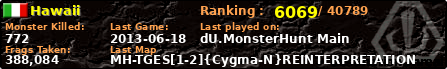 Hawaii | | PlayerID: | 13658 | | Overall MHT: | 388,084 | | Overall Deaths: | 114 | | Overall Suicides: | 0 | | Overall TeamKills: | 0 | | Overall Distance traveled: | 89km | | Overall Time Spend on Server: | 00days 07h 06m 42s | | Maps Played: | 18 | | Firstgame: | 2013-06-02 18:16:39 | | LastGame: | 2013-06-18 17:48:45 | | Player Ranking Place: | 6069 | | Used Playernames: | Hawaii