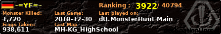 -=YF=- | | PlayerID: | 1366 | | Overall MHT: | 938,611 | | Overall Deaths: | 167 | | Overall Suicides: | 3 | | Overall TeamKills: | 1 | | Overall Distance traveled: | 214km | | Overall Time Spend on Server: | 00days 15h 54m 53s | | Maps Played: | 59 | | Firstgame: | 2010-09-18 23:11:58 | | LastGame: | 2010-12-30 03:26:32 | | Player Ranking Place: | 3922 | | Used Playernames: | -=YF=- Yuck_Fou