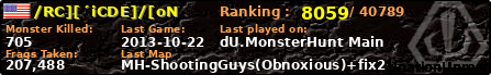 /RC][´iCDE]/[oN | | PlayerID: | 13687 | | Overall MHT: | 207,488 | | Overall Deaths: | 97 | | Overall Suicides: | 0 | | Overall TeamKills: | 0 | | Overall Distance traveled: | 63km | | Overall Time Spend on Server: | 00days 04h 12m 46s | | Maps Played: | 17 | | Firstgame: | 2013-06-07 03:24:20 | | LastGame: | 2013-10-22 01:56:22 | | Player Ranking Place: | 8059 | | Used Playernames: | /RC][´iCDE]/[oN