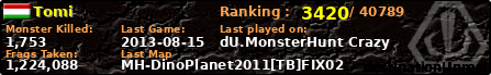 Tomi | | PlayerID: | 14225 | | Overall MHT: | 1,224,088 | | Overall Deaths: | 89 | | Overall Suicides: | 0 | | Overall TeamKills: | 0 | | Overall Distance traveled: | 69km | | Overall Time Spend on Server: | 00days 06h 14m 25s | | Maps Played: | 19 | | Firstgame: | 2013-08-05 14:15:59 | | LastGame: | 2013-08-15 13:32:37 | | Player Ranking Place: | 3420 | | Used Playernames: | Tomi
