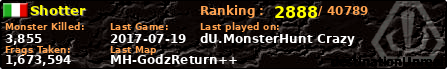 Shotter | | PlayerID: | 14327 | | Overall MHT: | 1,673,594 | | Overall Deaths: | 439 | | Overall Suicides: | 27 | | Overall TeamKills: | 53 | | Overall Distance traveled: | 452km | | Overall Time Spend on Server: | 01days 10h 32m 52s | | Maps Played: | 143 | | Firstgame: | 2013-08-16 11:18:24 | | LastGame: | 2017-07-19 20:51:30 | | Player Ranking Place: | 2888 | | Used Playernames: | Shotter Basic_Test