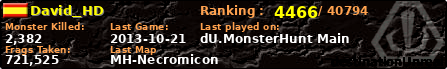 David_HD | | PlayerID: | 14467 | | Overall MHT: | 721,525 | | Overall Deaths: | 349 | | Overall Suicides: | 3 | | Overall TeamKills: | 2 | | Overall Distance traveled: | 260km | | Overall Time Spend on Server: | 00days 17h 33m 49s | | Maps Played: | 51 | | Firstgame: | 2013-08-28 21:47:09 | | LastGame: | 2013-10-21 21:31:08 | | Player Ranking Place: | 4466 | | Used Playernames: | David_HD *-David_Spain-* -_David*War*Spain_-
