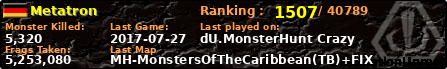 Metatron | | PlayerID: | 14614 | | Overall MHT: | 5,253,080 | | Overall Deaths: | 75 | | Overall Suicides: | 0 | | Overall TeamKills: | 0 | | Overall Distance traveled: | 100km | | Overall Time Spend on Server: | 00days 08h 21m 05s | | Maps Played: | 50 | | Firstgame: | 2013-09-09 22:16:25 | | LastGame: | 2017-07-27 17:52:06 | | Player Ranking Place: | 1507 | | Used Playernames: | Metatron [UT]Sashman