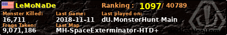 LeMoNaDe | | PlayerID: | 14671 | | Overall MHT: | 9,071,186 | | Overall Deaths: | 516 | | Overall Suicides: | 2 | | Overall TeamKills: | 6 | | Overall Distance traveled: | 899km | | Overall Time Spend on Server: | 02days 15h 16m 26s | | Maps Played: | 288 | | Firstgame: | 2013-09-15 19:00:27 | | LastGame: | 2018-11-11 08:36:23 | | Player Ranking Place: | 1097 | | Used Playernames: | LeMoNaDe