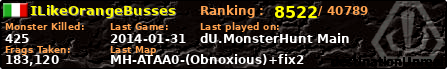 ILikeOrangeBusses | | PlayerID: | 14806 | | Overall MHT: | 183,120 | | Overall Deaths: | 132 | | Overall Suicides: | 4 | | Overall TeamKills: | 1 | | Overall Distance traveled: | 67km | | Overall Time Spend on Server: | 00days 05h 22m 50s | | Maps Played: | 26 | | Firstgame: | 2013-10-02 17:26:10 | | LastGame: | 2014-01-31 21:57:56 | | Player Ranking Place: | 8522 | | Used Playernames: | ILikeOrangeBusses ILikeOrangeBus
