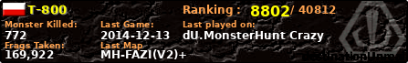 T-800 | | PlayerID: | 14857 | | Overall MHT: | 169,922 | | Overall Deaths: | 239 | | Overall Suicides: | 139 | | Overall TeamKills: | 15 | | Overall Distance traveled: | 40km | | Overall Time Spend on Server: | 00days 03h 14m 45s | | Maps Played: | 17 | | Firstgame: | 2013-10-08 20:28:41 | | LastGame: | 2014-12-13 02:23:42 | | Player Ranking Place: | 8802 | | Used Playernames: | T-800 GiveMeFun