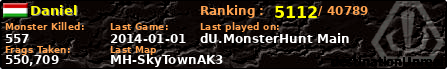 Daniel | | PlayerID: | 15496 | | Overall MHT: | 550,709 | | Overall Deaths: | 127 | | Overall Suicides: | 0 | | Overall TeamKills: | 5 | | Overall Distance traveled: | 89km | | Overall Time Spend on Server: | 00days 07h 58m 05s | | Maps Played: | 39 | | Firstgame: | 2013-12-13 20:57:01 | | LastGame: | 2014-01-01 00:41:02 | | Player Ranking Place: | 5112 | | Used Playernames: | Daniel