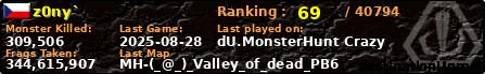 z0ny` | | PlayerID: | 15568 | | Overall MHT: | 344,615,907 | | Overall Deaths: | 2712 | | Overall Suicides: | 1194 | | Overall TeamKills: | 7 | | Overall Distance traveled: | 3,767km | | Overall Time Spend on Server: | 12days 22h 42m 29s | | Maps Played: | 842 | | Firstgame: | 2013-12-20 01:23:35 | | LastGame: | 2025-08-28 19:42:38 | | Player Ranking Place: | 69 | | Used Playernames: | z0ny` TmC^z0ny` fffoo