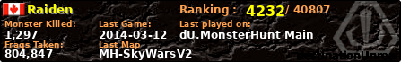 Raiden | | PlayerID: | 15988 | | Overall MHT: | 804,847 | | Overall Deaths: | 41 | | Overall Suicides: | 0 | | Overall TeamKills: | 0 | | Overall Distance traveled: | 81km | | Overall Time Spend on Server: | 00days 07h 23m 49s | | Maps Played: | 20 | | Firstgame: | 2014-01-22 12:40:49 | | LastGame: | 2014-03-12 09:58:51 | | Player Ranking Place: | 4232 | | Used Playernames: | Raiden