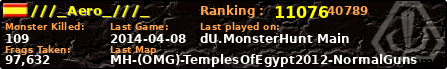 ///_Aero_///_ | | PlayerID: | 16265 | | Overall MHT: | 97,632 | | Overall Deaths: | 38 | | Overall Suicides: | 0 | | Overall TeamKills: | 0 | | Overall Distance traveled: | 28km | | Overall Time Spend on Server: | 00days 01h 57m 57s | | Maps Played: | 17 | | Firstgame: | 2014-02-17 16:07:17 | | LastGame: | 2014-04-08 13:31:40 | | Player Ranking Place: | 11076 | | Used Playernames: | ///_Aero_///_