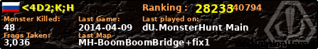 | Server | Map | LastGame | Score | Teamscore | Monsterleft | Deaths | Suicides | TKs | Distance | Playtime | |