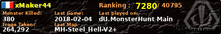 | Server | Map | LastGame | Score | Teamscore | Monsterleft | Deaths | Suicides | TKs | Distance | Playtime | |