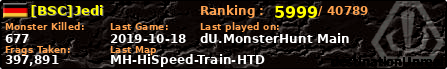 [BSC]Jedi | | PlayerID: | 17765 | | Overall MHT: | 397,891 | | Overall Deaths: | 89 | | Overall Suicides: | 0 | | Overall TeamKills: | 1 | | Overall Distance traveled: | 78km | | Overall Time Spend on Server: | 00days 05h 46m 53s | | Maps Played: | 22 | | Firstgame: | 2014-08-21 19:51:47 | | LastGame: | 2019-10-18 17:34:33 | | Player Ranking Place: | 5999 | | Used Playernames: | [BSC]Jedi [BSC]Santacow Skill2509