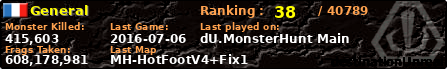 General | | PlayerID: | 18006 | | Overall MHT: | 608,178,981 | | Overall Deaths: | 1721 | | Overall Suicides: | 3 | | Overall TeamKills: | 70 | | Overall Distance traveled: | 9,080km | | Overall Time Spend on Server: | 45days 06h 26m 21s | | Maps Played: | 2962 | | Firstgame: | 2014-09-14 08:32:52 | | LastGame: | 2016-07-06 17:34:37 | | Player Ranking Place: | 38 | | Used Playernames: | General