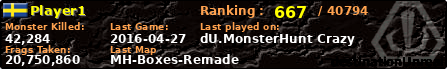 Player1 | | PlayerID: | 18038 | | Overall MHT: | 20,750,860 | | Overall Deaths: | 435 | | Overall Suicides: | 0 | | Overall TeamKills: | 0 | | Overall Distance traveled: | 555km | | Overall Time Spend on Server: | 02days 03h 56m 50s | | Maps Played: | 126 | | Firstgame: | 2014-09-17 17:34:42 | | LastGame: | 2016-04-27 12:36:15 | | Player Ranking Place: | 667 | | Used Playernames: | Player1 Bad()Max