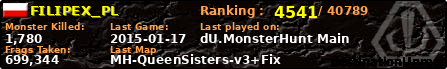 FILIPEX_PL | | PlayerID: | 18173 | | Overall MHT: | 699,344 | | Overall Deaths: | 267 | | Overall Suicides: | 0 | | Overall TeamKills: | 2 | | Overall Distance traveled: | 149km | | Overall Time Spend on Server: | 00days 10h 56m 08s | | Maps Played: | 46 | | Firstgame: | 2014-09-29 15:36:49 | | LastGame: | 2015-01-17 14:29:38 | | Player Ranking Place: | 4541 | | Used Playernames: | FILIPEX_PL