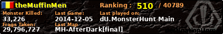 theMuffinMen | | PlayerID: | 18264 | | Overall MHT: | 29,796,727 | | Overall Deaths: | 594 | | Overall Suicides: | 0 | | Overall TeamKills: | 13 | | Overall Distance traveled: | 1,577km | | Overall Time Spend on Server: | 05days 20h 36m 14s | | Maps Played: | 331 | | Firstgame: | 2014-10-06 10:32:31 | | LastGame: | 2014-12-05 08:05:21 | | Player Ranking Place: | 510 | | Used Playernames: | theMuffinMen