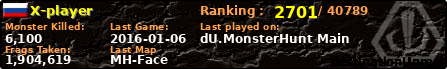 X-player | | PlayerID: | 18785 | | Overall MHT: | 1,904,619 | | Overall Deaths: | 465 | | Overall Suicides: | 25 | | Overall TeamKills: | 6 | | Overall Distance traveled: | 291km | | Overall Time Spend on Server: | 00days 20h 39m 52s | | Maps Played: | 56 | | Firstgame: | 2014-11-20 09:38:02 | | LastGame: | 2016-01-06 16:53:10 | | Player Ranking Place: | 2701 | | Used Playernames: | X-player