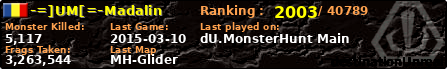 -=]UM[=-Madalin | | PlayerID: | 18990 | | Overall MHT: | 3,263,544 | | Overall Deaths: | 425 | | Overall Suicides: | 2 | | Overall TeamKills: | 5 | | Overall Distance traveled: | 338km | | Overall Time Spend on Server: | 01days 12h 06m 36s | | Maps Played: | 130 | | Firstgame: | 2014-12-06 11:54:04 | | LastGame: | 2015-03-10 10:36:52 | | Player Ranking Place: | 2003 | | Used Playernames: | -=]UM[=-Madalin