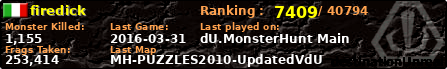 firedick | | PlayerID: | 19417 | | Overall MHT: | 253,414 | | Overall Deaths: | 324 | | Overall Suicides: | 5 | | Overall TeamKills: | 4 | | Overall Distance traveled: | 181km | | Overall Time Spend on Server: | 00days 13h 06m 46s | | Maps Played: | 54 | | Firstgame: | 2015-01-09 14:32:52 | | LastGame: | 2016-03-31 21:14:51 | | Player Ranking Place: | 7409 | | Used Playernames: | firedick Astaroth