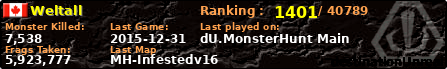 Weltall | | PlayerID: | 19513 | | Overall MHT: | 5,923,777 | | Overall Deaths: | 283 | | Overall Suicides: | 2 | | Overall TeamKills: | 1 | | Overall Distance traveled: | 385km | | Overall Time Spend on Server: | 01days 05h 50m 05s | | Maps Played: | 124 | | Firstgame: | 2015-01-17 20:47:00 | | LastGame: | 2015-12-31 03:56:13 | | Player Ranking Place: | 1401 | | Used Playernames: | Weltall