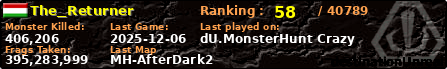The_Returner | | PlayerID: | 2012 | | Overall MHT: | 395,283,999 | | Overall Deaths: | 4526 | | Overall Suicides: | 94 | | Overall TeamKills: | 2 | | Overall Distance traveled: | 8,834km | | Overall Time Spend on Server: | 32days 03h 02m 23s | | Maps Played: | 2350 | | Firstgame: | 2010-11-03 23:18:06 | | LastGame: | 2025-12-06 02:37:25 | | Player Ranking Place: | 58 | | Used Playernames: | The_Returner DebilTurner The_Returner_(Hun)