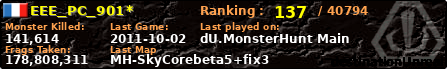 EEE_PC_901* | | PlayerID: | 204 | | Overall MHT: | 178,808,311 | | Overall Deaths: | 4337 | | Overall Suicides: | 24 | | Overall TeamKills: | 49 | | Overall Distance traveled: | 5,719km | | Overall Time Spend on Server: | 22days 23h 12m 08s | | Maps Played: | 1605 | | Firstgame: | 2010-08-03 04:20:41 | | LastGame: | 2011-10-02 17:44:57 | | Player Ranking Place: | 137 | | Used Playernames: | EEE_PC_901* laminak