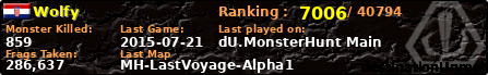 Wolfy | | PlayerID: | 20490 | | Overall MHT: | 286,637 | | Overall Deaths: | 82 | | Overall Suicides: | 2 | | Overall TeamKills: | 0 | | Overall Distance traveled: | 47km | | Overall Time Spend on Server: | 00days 03h 56m 15s | | Maps Played: | 15 | | Firstgame: | 2015-04-23 10:56:24 | | LastGame: | 2015-07-21 09:45:08 | | Player Ranking Place: | 7006 | | Used Playernames: | Wolfy