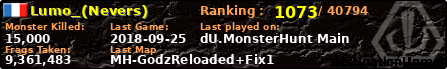 Lumo_(Nevers) | | PlayerID: | 20511 | | Overall MHT: | 9,361,483 | | Overall Deaths: | 1258 | | Overall Suicides: | 97 | | Overall TeamKills: | 9 | | Overall Distance traveled: | 1,052km | | Overall Time Spend on Server: | 03days 15h 11m 37s | | Maps Played: | 422 | | Firstgame: | 2015-04-25 21:21:49 | | LastGame: | 2018-09-25 23:35:21 | | Player Ranking Place: | 1073 | | Used Playernames: | Lumo_(Nevers)