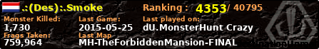 | Server | Map | LastGame | Score | Teamscore | Monsterleft | Deaths | Suicides | TKs | Distance | Playtime | |