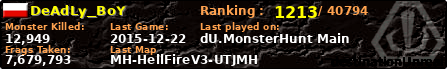 DeAdLy_BoY | | PlayerID: | 20995 | | Overall MHT: | 7,679,793 | | Overall Deaths: | 1135 | | Overall Suicides: | 84 | | Overall TeamKills: | 27 | | Overall Distance traveled: | 796km | | Overall Time Spend on Server: | 02days 23h 33m 48s | | Maps Played: | 328 | | Firstgame: | 2015-06-10 13:49:53 | | LastGame: | 2015-12-22 21:37:12 | | Player Ranking Place: | 1213 | | Used Playernames: | DeAdLy_BoY