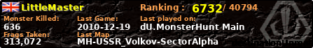 LittleMaster | | PlayerID: | 2113 | | Overall MHT: | 313,072 | | Overall Deaths: | 26 | | Overall Suicides: | 0 | | Overall TeamKills: | 0 | | Overall Distance traveled: | 41km | | Overall Time Spend on Server: | 00days 02h 55m 27s | | Maps Played: | 17 | | Firstgame: | 2010-11-14 20:42:51 | | LastGame: | 2010-12-19 18:10:57 | | Player Ranking Place: | 6732 | | Used Playernames: | LittleMaster Mr.Resetti PorkSword MushYPeaS JBC