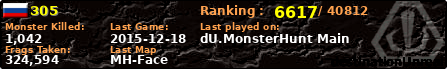 305 | | PlayerID: | 22289 | | Overall MHT: | 324,594 | | Overall Deaths: | 144 | | Overall Suicides: | 0 | | Overall TeamKills: | 3 | | Overall Distance traveled: | 93km | | Overall Time Spend on Server: | 00days 06h 46m 47s | | Maps Played: | 27 | | Firstgame: | 2015-10-15 16:37:34 | | LastGame: | 2015-12-18 15:08:40 | | Player Ranking Place: | 6617 | | Used Playernames: | 305