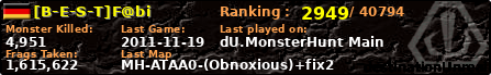 [B-E-S-T]F@bi | | PlayerID: | 2229 | | Overall MHT: | 1,615,622 | | Overall Deaths: | 629 | | Overall Suicides: | 68 | | Overall TeamKills: | 24 | | Overall Distance traveled: | 288km | | Overall Time Spend on Server: | 00days 21h 26m 26s | | Maps Played: | 87 | | Firstgame: | 2010-11-29 16:04:31 | | LastGame: | 2011-11-19 12:10:29 | | Player Ranking Place: | 2949 | | Used Playernames: | [B-E-S-T]F@bi (B-E-S-T)Fabi (Master)Fabi Fabi_Babey {BTW}Fabi (Master)_Fabi