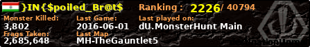 }IN{$poiled_Br@t$ | | PlayerID: | 22550 | | Overall MHT: | 2,685,648 | | Overall Deaths: | 200 | | Overall Suicides: | 40 | | Overall TeamKills: | 1 | | Overall Distance traveled: | 226km | | Overall Time Spend on Server: | 00days 18h 56m 41s | | Maps Played: | 97 | | Firstgame: | 2015-11-07 20:27:12 | | LastGame: | 2016-06-01 18:48:58 | | Player Ranking Place: | 2226 | | Used Playernames: | }IN{$poiled_Br@t$ }IN{M@rvel