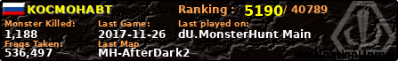 KOCMOHABT | | PlayerID: | 22706 | | Overall MHT: | 536,497 | | Overall Deaths: | 169 | | Overall Suicides: | 0 | | Overall TeamKills: | 1 | | Overall Distance traveled: | 125km | | Overall Time Spend on Server: | 00days 07h 44m 34s | | Maps Played: | 38 | | Firstgame: | 2015-11-19 14:36:25 | | LastGame: | 2017-11-26 23:07:34 | | Player Ranking Place: | 5190 | | Used Playernames: | KOCMOHABT