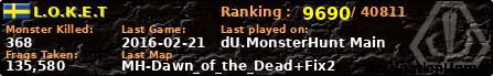 L.O.K.E.T | | PlayerID: | 23959 | | Overall MHT: | 135,580 | | Overall Deaths: | 72 | | Overall Suicides: | 0 | | Overall TeamKills: | 0 | | Overall Distance traveled: | 47km | | Overall Time Spend on Server: | 00days 03h 18m 35s | | Maps Played: | 15 | | Firstgame: | 2016-02-10 19:38:10 | | LastGame: | 2016-02-21 03:31:35 | | Player Ranking Place: | 9690 | | Used Playernames: | L.O.K.E.T