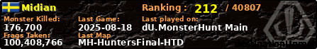 Midian | | PlayerID: | 2413 | | Overall MHT: | 100,408,766 | | Overall Deaths: | 6595 | | Overall Suicides: | 168 | | Overall TeamKills: | 60 | | Overall Distance traveled: | 8,020km | | Overall Time Spend on Server: | 25days 09h 07m 55s | | Maps Played: | 3443 | | Firstgame: | 2010-12-18 23:06:07 | | LastGame: | 2025-08-18 02:53:32 | | Player Ranking Place: | 212 | | Used Playernames: | Midian MidiCow Midian-II -=]UM[=-Midian