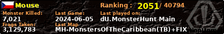 Mouse | | PlayerID: | 24347 | | Overall MHT: | 3,129,783 | | Overall Deaths: | 2024 | | Overall Suicides: | 2 | | Overall TeamKills: | 4 | | Overall Distance traveled: | 1,151km | | Overall Time Spend on Server: | 04days 14h 55m 47s | | Maps Played: | 332 | | Firstgame: | 2016-03-14 20:07:57 | | LastGame: | 2024-06-05 15:36:45 | | Player Ranking Place: | 2051 | | Used Playernames: | Mouse CZ)Pol