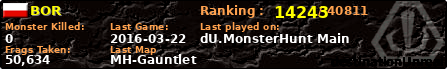 ![]() | MH-Gauntlet | 2016-03-22 14:46:11 | 50,647 | 764650 | ![]() | 0 | 0 | 0 | 1,94km | 00:12:46 |