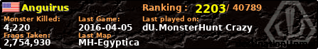 Anguirus | | PlayerID: | 24639 | | Overall MHT: | 2,754,930 | | Overall Deaths: | 214 | | Overall Suicides: | 4 | | Overall TeamKills: | 0 | | Overall Distance traveled: | 283km | | Overall Time Spend on Server: | 00days 21h 05m 45s | | Maps Played: | 58 | | Firstgame: | 2016-04-01 20:42:54 | | LastGame: | 2016-04-05 19:33:30 | | Player Ranking Place: | 2203 | | Used Playernames: | Anguirus Werewolf