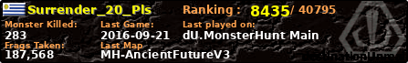 Surrender_20_Pls | | PlayerID: | 24713 | | Overall MHT: | 187,568 | | Overall Deaths: | 103 | | Overall Suicides: | 0 | | Overall TeamKills: | 1 | | Overall Distance traveled: | 67km | | Overall Time Spend on Server: | 00days 06h 52m 48s | | Maps Played: | 30 | | Firstgame: | 2016-04-06 10:00:16 | | LastGame: | 2016-09-21 09:57:49 | | Player Ranking Place: | 8435 | | Used Playernames: | Surrender_20_Pls
