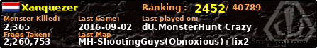 Xanquezer | | PlayerID: | 25261 | | Overall MHT: | 2,260,753 | | Overall Deaths: | 63 | | Overall Suicides: | 0 | | Overall TeamKills: | 0 | | Overall Distance traveled: | 65km | | Overall Time Spend on Server: | 00days 04h 54m 40s | | Maps Played: | 17 | | Firstgame: | 2016-05-16 18:17:43 | | LastGame: | 2016-09-02 18:30:05 | | Player Ranking Place: | 2452 | | Used Playernames: | Xanquezer