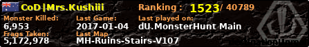 CoD|Mrs.Kushiii | | PlayerID: | 26743 | | Overall MHT: | 5,172,978 | | Overall Deaths: | 254 | | Overall Suicides: | 11 | | Overall TeamKills: | 7 | | Overall Distance traveled: | 341km | | Overall Time Spend on Server: | 01days 17h 30m 30s | | Maps Played: | 192 | | Firstgame: | 2016-09-13 13:37:28 | | LastGame: | 2017-01-04 12:14:47 | | Player Ranking Place: | 1523 | | Used Playernames: | CoD|Mrs.Kushiii poohead