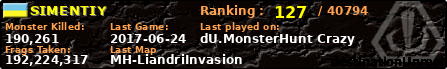 SIMENTIY | | PlayerID: | 27777 | | Overall MHT: | 192,224,317 | | Overall Deaths: | 1241 | | Overall Suicides: | 21 | | Overall TeamKills: | 0 | | Overall Distance traveled: | 2,999km | | Overall Time Spend on Server: | 10days 04h 17m 57s | | Maps Played: | 901 | | Firstgame: | 2016-12-09 15:33:30 | | LastGame: | 2017-06-24 17:58:55 | | Player Ranking Place: | 127 | | Used Playernames: | SIMENTIY