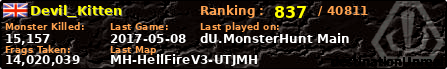 Devil_Kitten | | PlayerID: | 27962 | | Overall MHT: | 14,020,039 | | Overall Deaths: | 564 | | Overall Suicides: | 5 | | Overall TeamKills: | 9 | | Overall Distance traveled: | 805km | | Overall Time Spend on Server: | 05days 08h 21m 58s | | Maps Played: | 363 | | Firstgame: | 2016-12-23 08:06:29 | | LastGame: | 2017-05-08 18:29:43 | | Player Ranking Place: | 837 | | Used Playernames: | Devil_Kitten