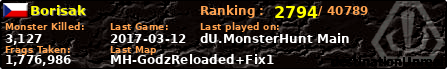 Borisak | | PlayerID: | 28187 | | Overall MHT: | 1,776,986 | | Overall Deaths: | 189 | | Overall Suicides: | 0 | | Overall TeamKills: | 4 | | Overall Distance traveled: | 191km | | Overall Time Spend on Server: | 00days 13h 12m 13s | | Maps Played: | 74 | | Firstgame: | 2017-01-02 12:44:42 | | LastGame: | 2017-03-12 20:13:35 | | Player Ranking Place: | 2794 | | Used Playernames: | Borisak