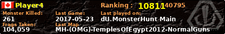 | Server | Map | LastGame | Score | Teamscore | Monsterleft | Deaths | Suicides | TKs | Distance | Playtime | |